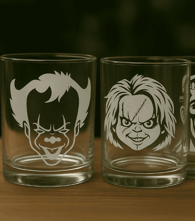 Elevate your Halloween gatherings with our exclusive set of four glass whiskey cups, each meticulously laser engraved with iconic imagery inspired by classic horror movies featuring notorious serial killers. Crafted in the USA, these high-quality whiskey cups not only serve a functional purpose but also add a chilling touch to your drinkware collection. Perfect for enthusiasts of the genre, this unique set makes an ideal gift for collectors and horror aficionados alike, ensuring a spine-tingling experience with every sip.